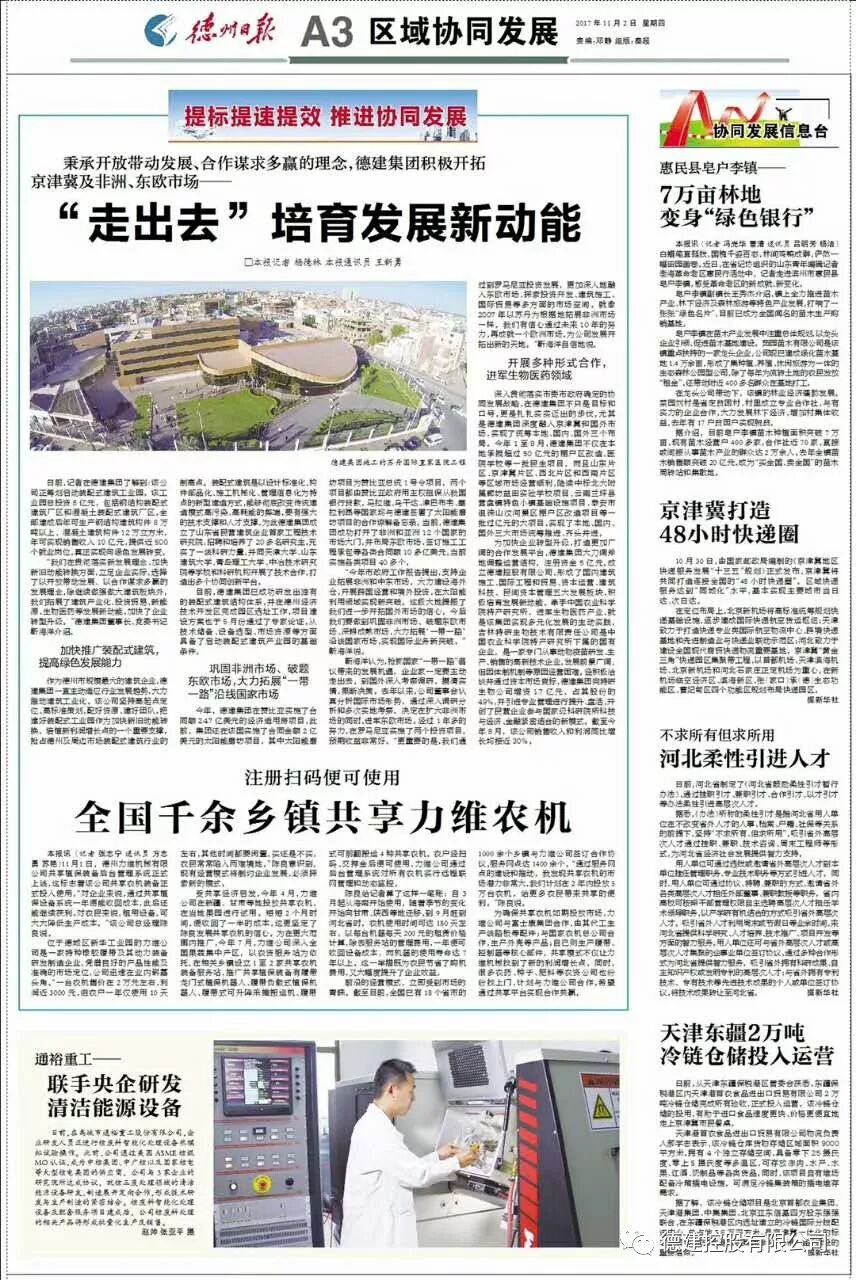 深入贯彻落实市委市政府确定的协同发展战略,在德建集团不只是目标和口号,更是扎扎实实迈出的步伐,尤其是德建集团深度融入京津冀和国外市场,实现了统筹本地、国内、国外三个布局。今年1至8月,德建集团不仅在本地承揽超过50亿元的棚户区改造、医院学校建设等一批民生项目,而且山东片区、京津冀片区、西北片区和西南片区等区域市场经营顺利,陆续中标北大附属廊坊益田实验学校项目、云南兰坪县营盘镇特色小镇基础设施项目、泰安市徂徕山汶河景区棚户区改造项目等一批过亿元的大项目,实现了本地、国内、国外三大市场统筹推进、齐头并进。